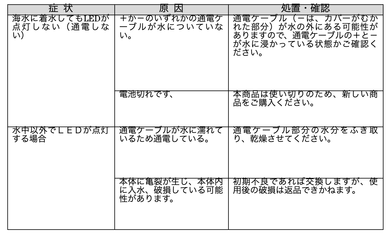 釣りを開始する前に海水バケツなどに一度本商品をつけ、通電・稼働するかを確認してください。